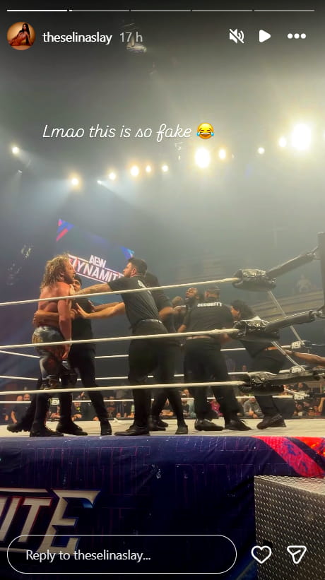 Одной из этих девушек является онлифанщица Селина Слэй (на фото она — слева за Андраде), которую, видимо, специально пригласили на шоу для поддержания образа Андраде, согласно которому он пользуется успехом у женщин. Ранее для таких целей приглашали инди-рестлерш или тех, с кем уже ранее работали (причем как в AEW, так и в WWE). Лучше бы и в этот раз обратились к проверенным кадрам, потому что Слэй у себя в соц.сетях опубликовала сторис, подписав его «Это так фальшиво».